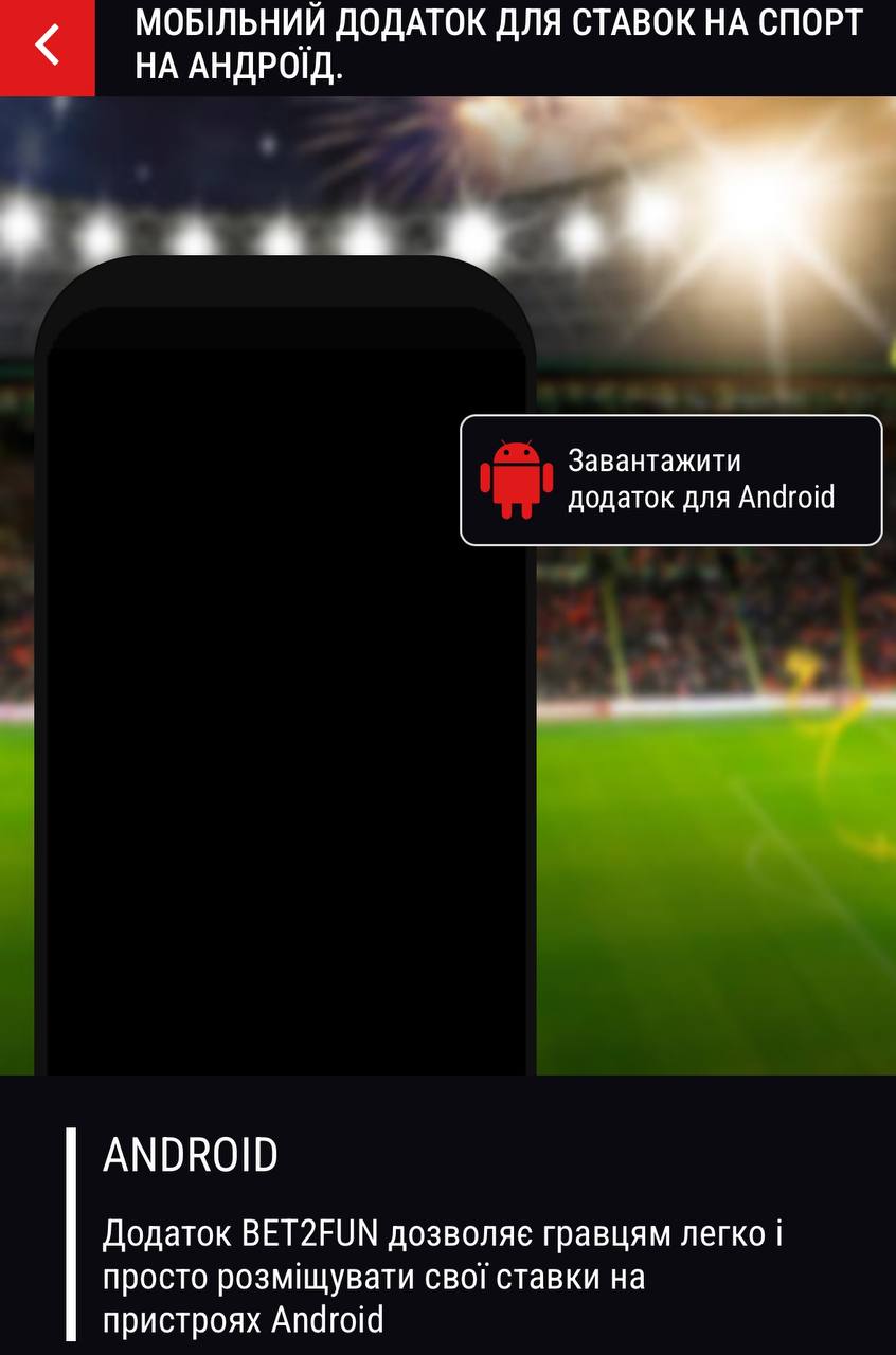 В Україні, в букмекерській компанії BET2FUN, розробники створили інтуїтивно зрозумілий та функціональний мобільний додаток. Наразі, ви можете його завантажити на пристрій Android, для iOS знаходиться на стадії активної розробки. Гравцям, які віддають перевагу мобільним ставкам, мають можливість завантажити безпосередньо на свій мобільний телефон через офіційний сайт BET2FUN. Основні переваги використання мобільного додатку полягають у тому, що він завжди з вами, не потребує додаткового входу або верифікації , а також забезпечує безперебійний доступ до прямих трансляцій.